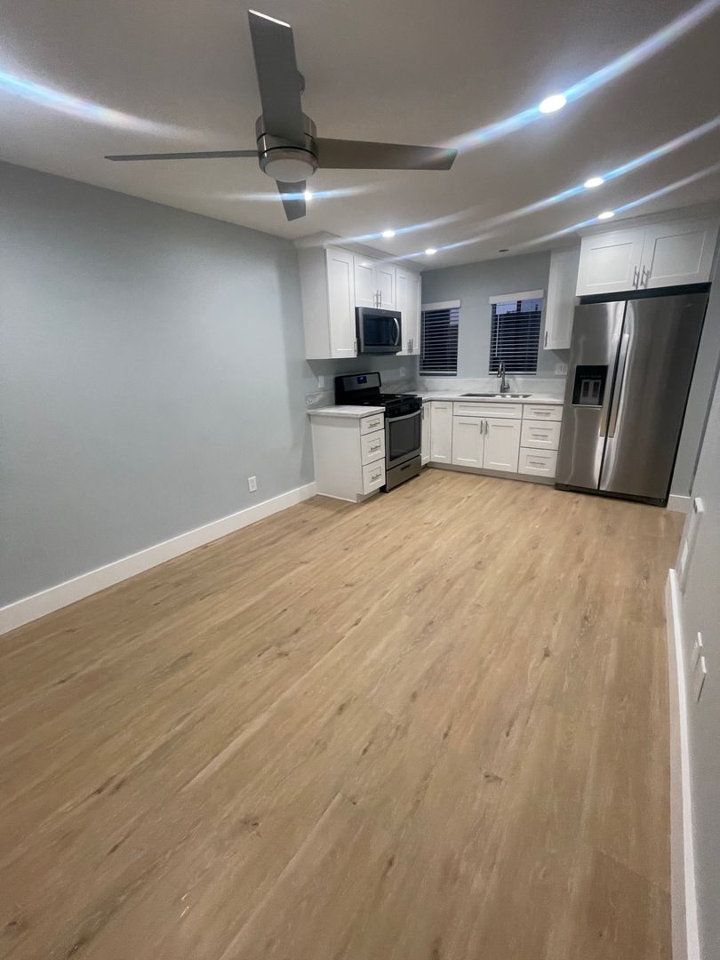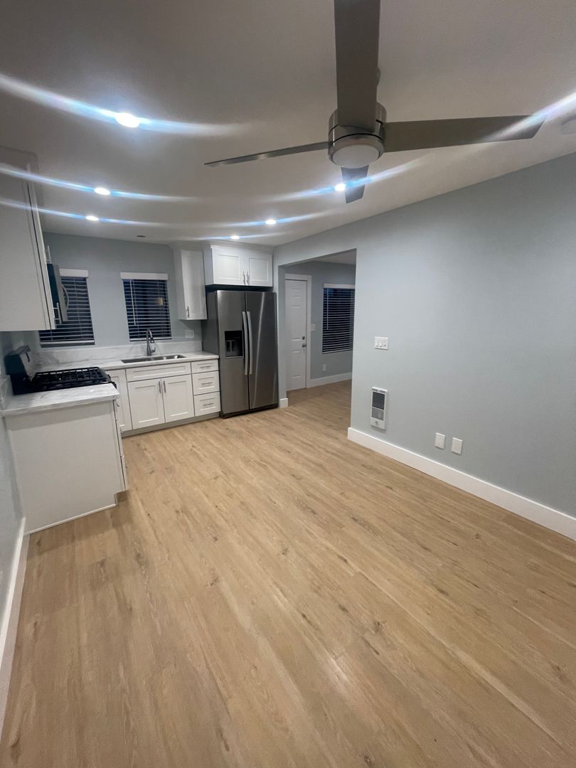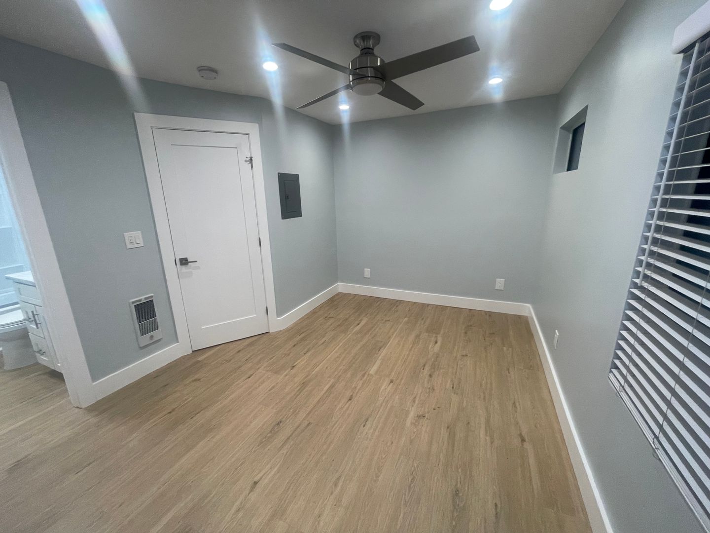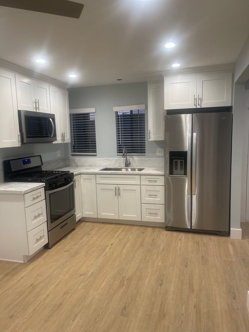 This charming apartment has white shaker cabinetry, marble white counters, stylish laminate wood flooring, soothing paint colors that reflect the Pacific Ocean, white wood blinds and contemporary ceiling fans. The apartment rent is $2900 monthly plus $50 monthly garage rent by separate lease for a total of $2950 monthly.