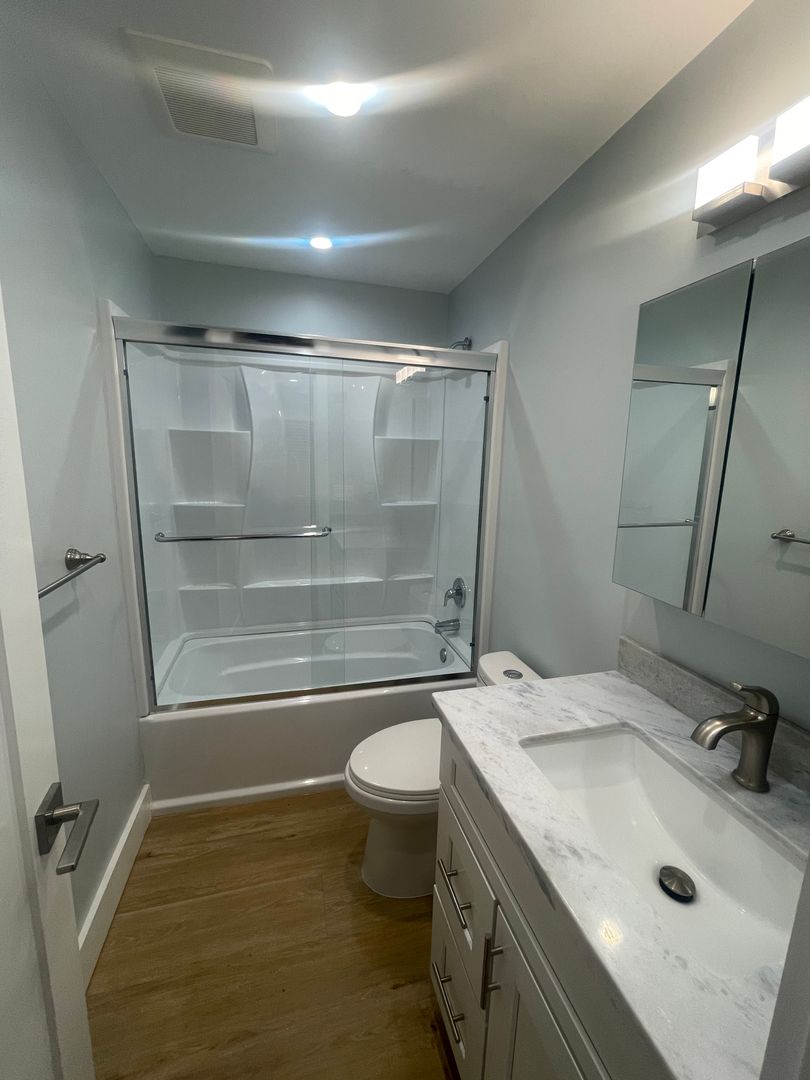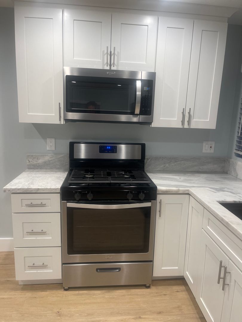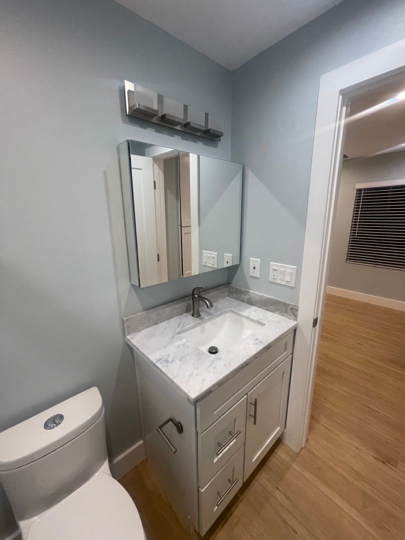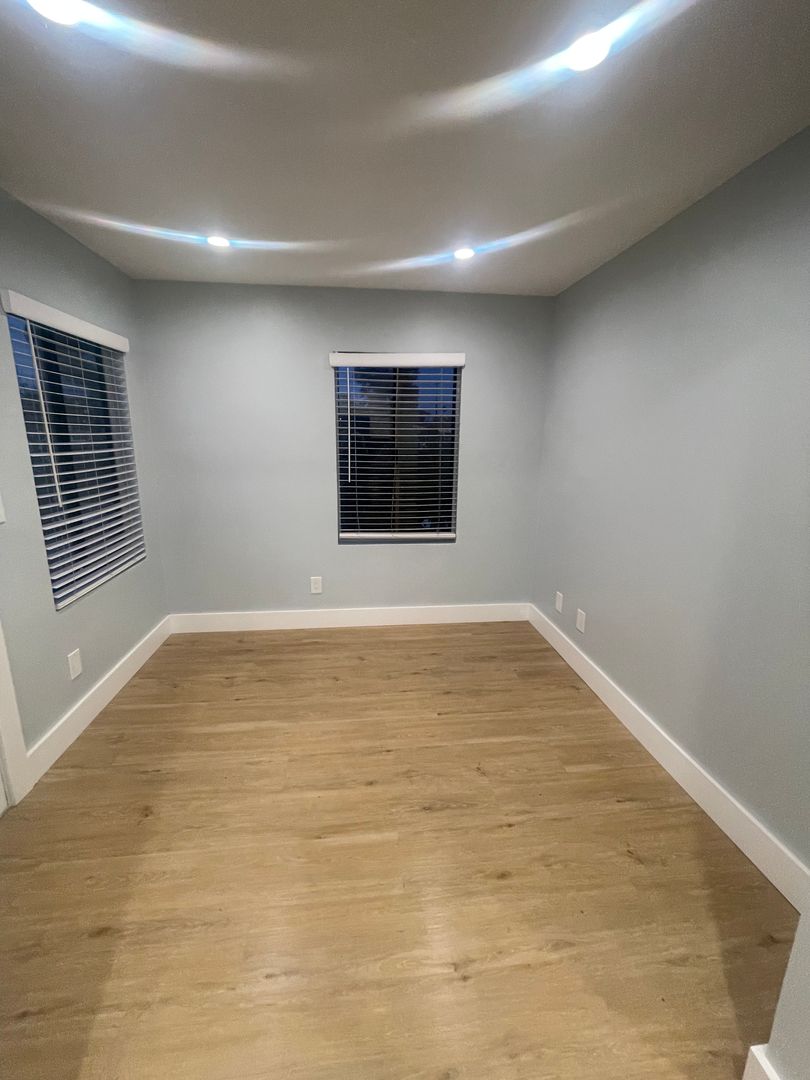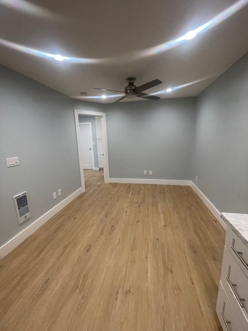 This charming apartment has white shaker cabinetry, marble white counters, stylish laminate wood flooring, soothing paint colors that reflect the Pacific Ocean, white wood blinds and contemporary ceiling fans. The apartment rent is $2900 monthly plus $50 monthly garage rent by separate lease for a total of $2950 monthly.