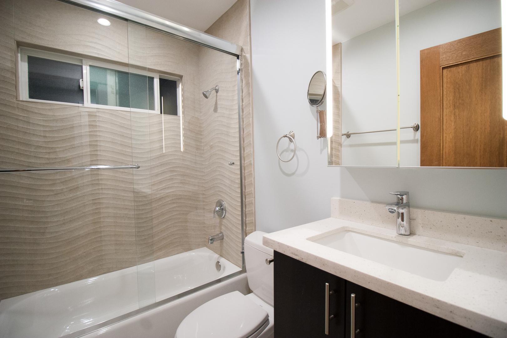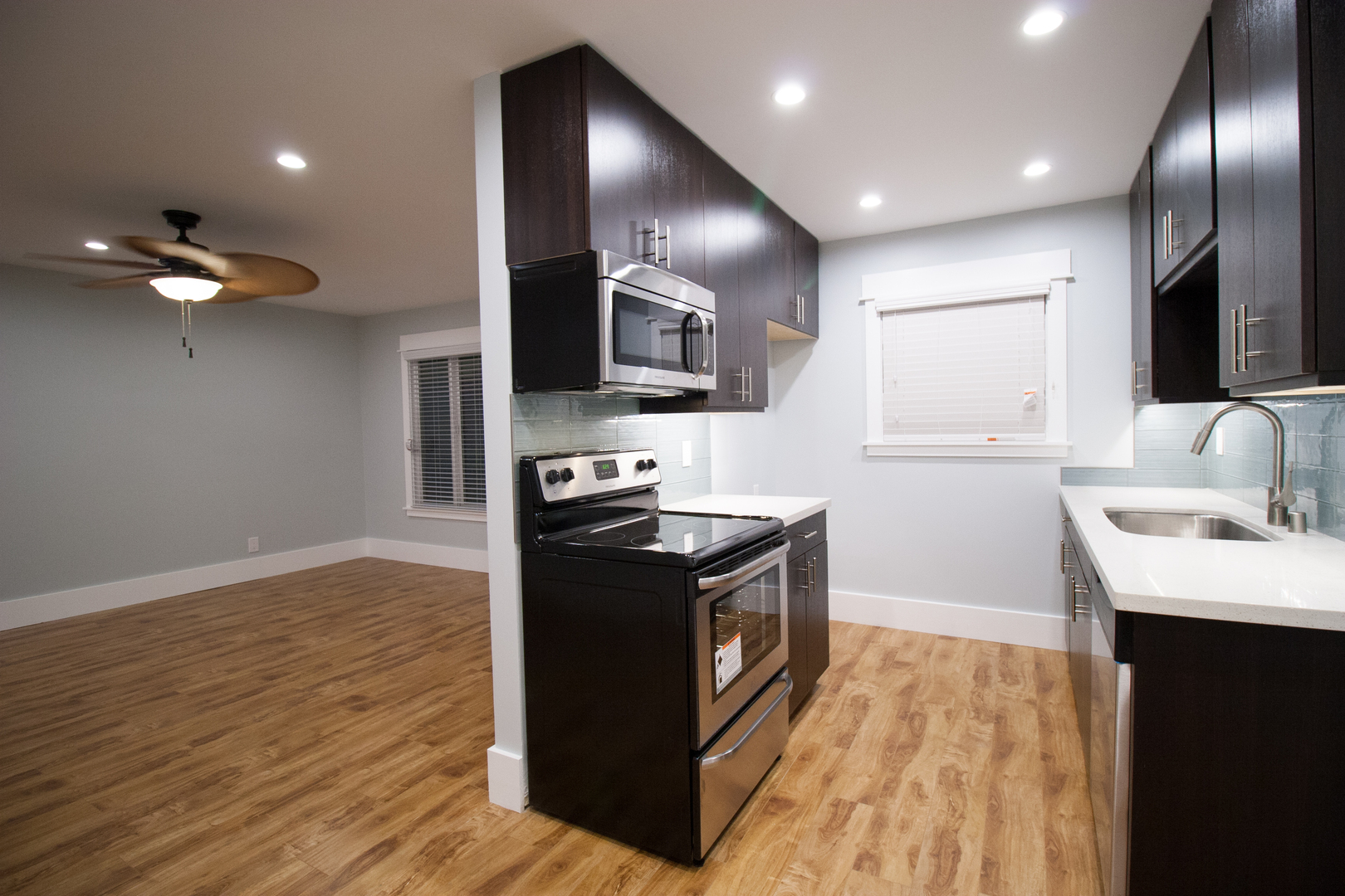 This completely remodeled two bedroom apartment is a true beauty: The new kitchen sparkles with stainless steel appliances, modern cabinetry, sparkling white quartz counters, a stunning glass tile kitchen backsplash,craftsman moldings throughout, calcutta porcelain tile ion the bathroom floor, a "wave" tile above the soaker bathtub, dual glazed windows, tropical ceiling fans, stylish laminate wood flooring, and much more.