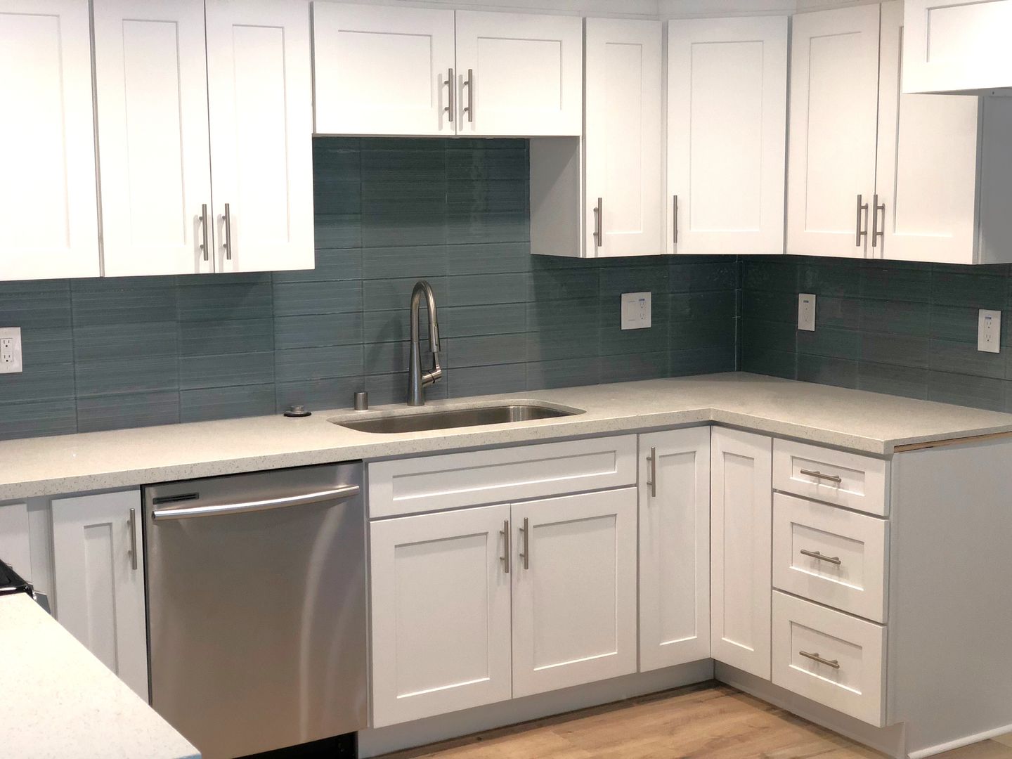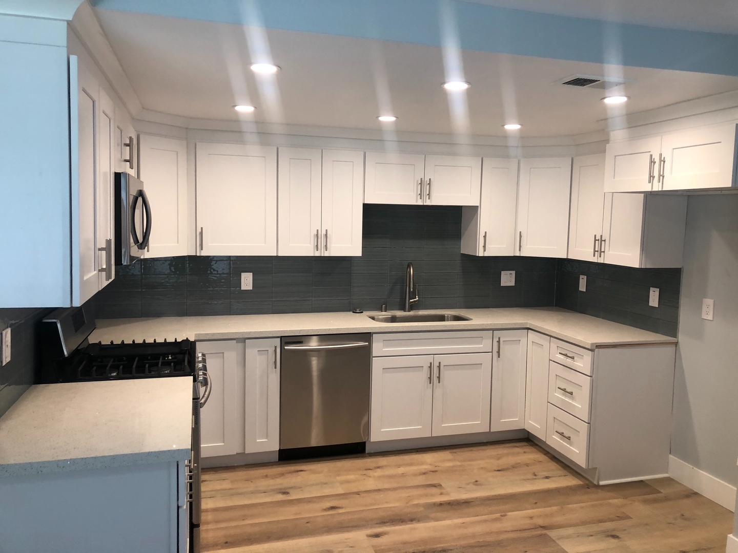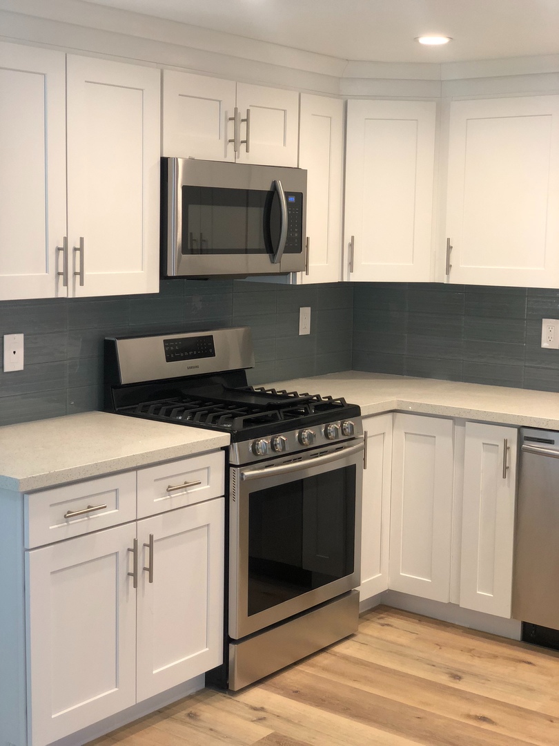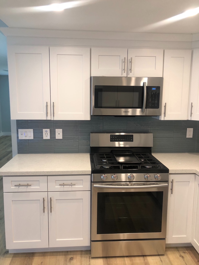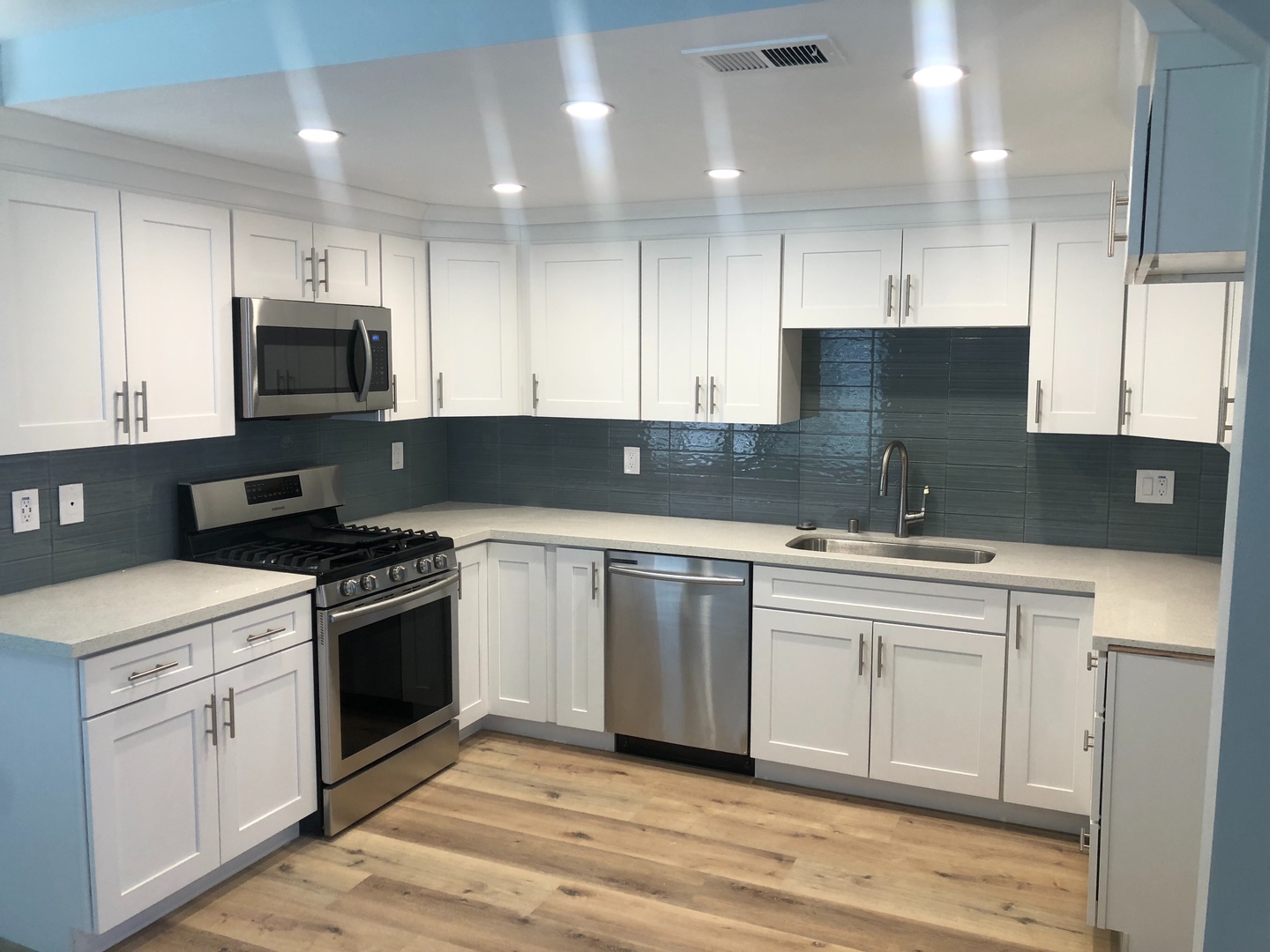 Shaker white cabinets and sparkling quartz counters with blue glass backsplash accentuate the stunning laminate wood flooring and soothing light blue walls. Includes private patio off the kitchen and attached two car garage with washer dryer hookups.