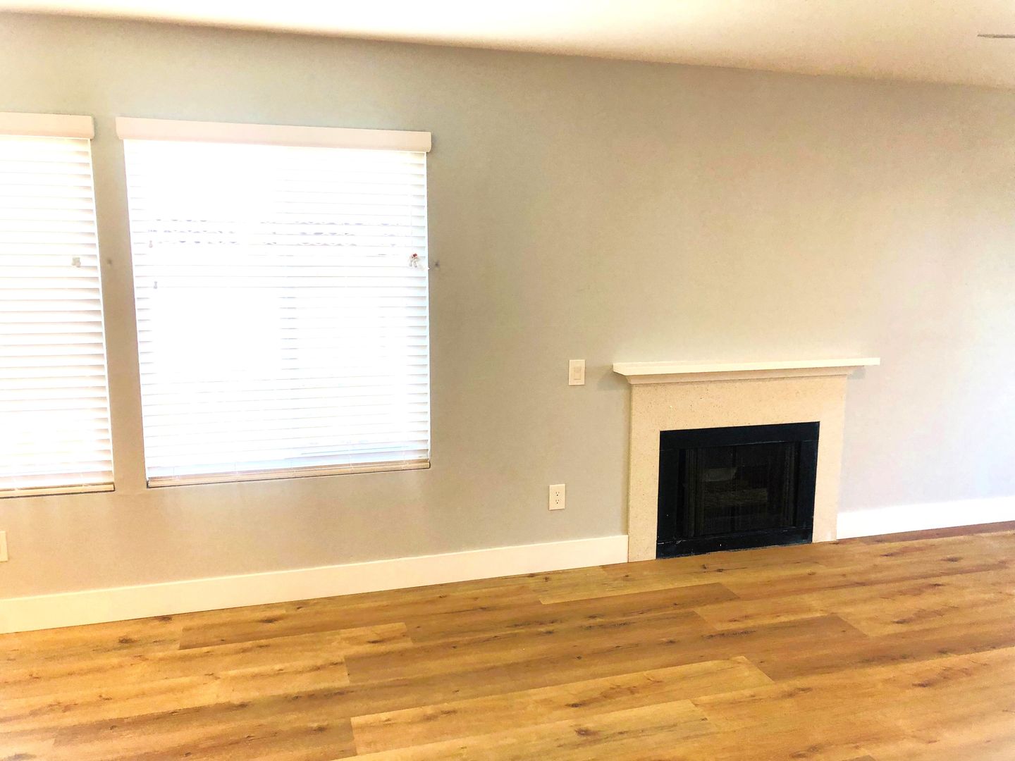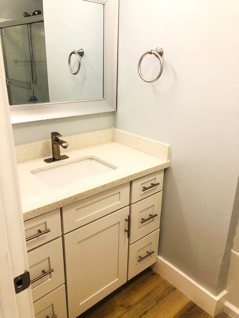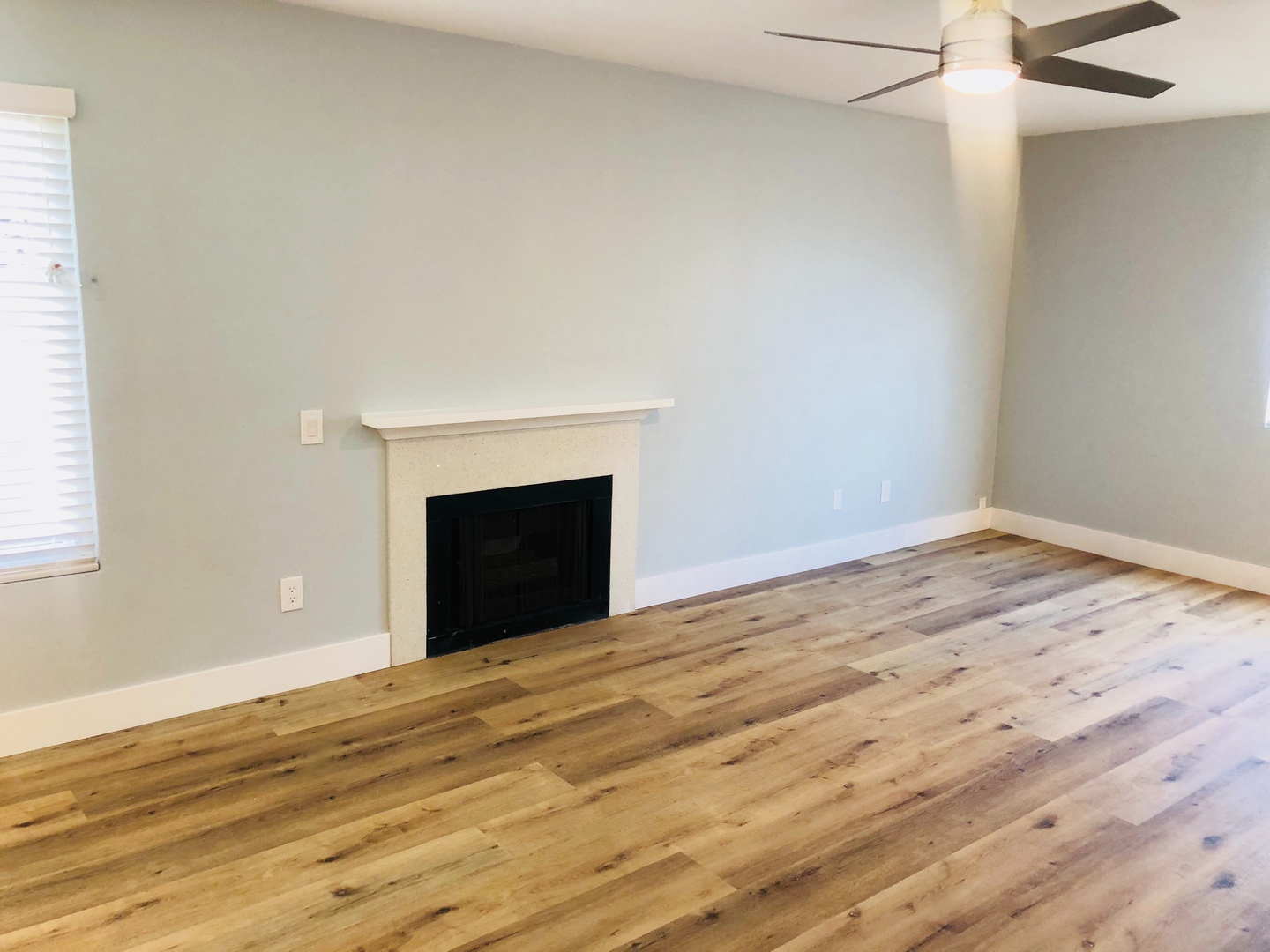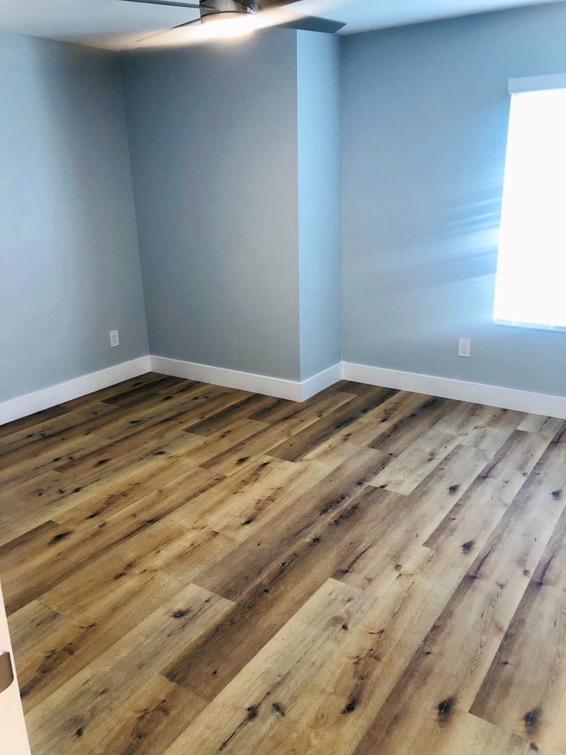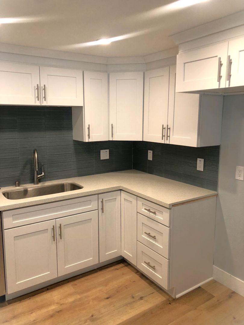 Shaker white cabinets and sparkling quartz counters with blue glass backsplash accentuate the stunning laminate wood flooring and soothing light blue walls. Includes private patio off the kitchen and attached two car garage with washer dryer hookups.