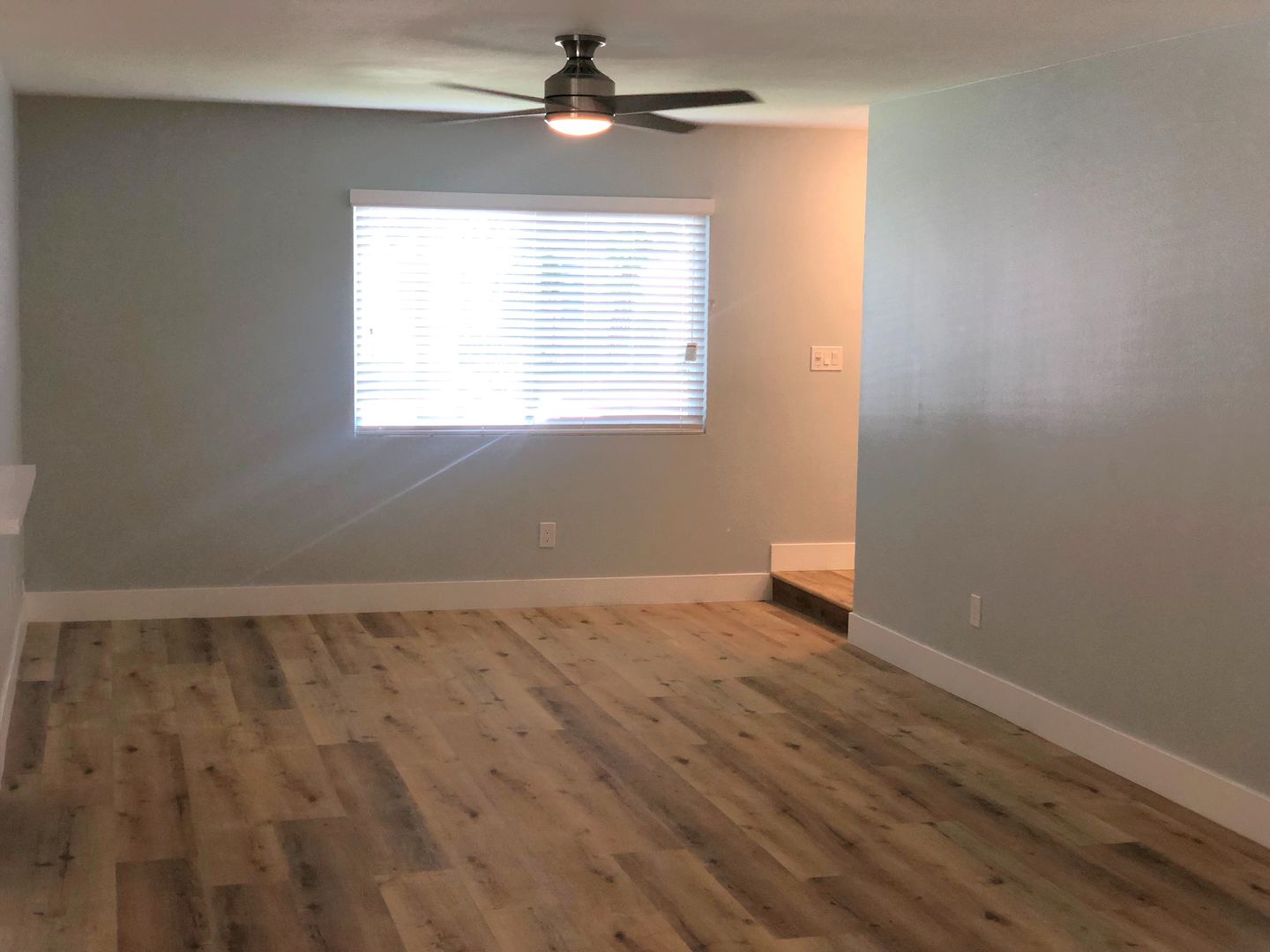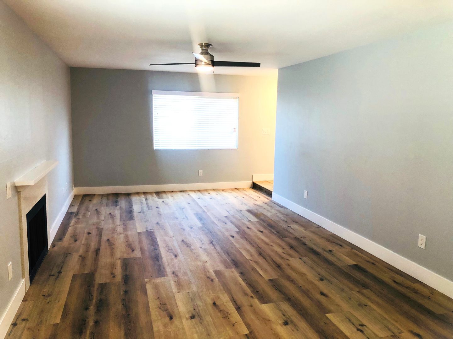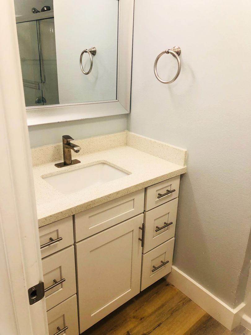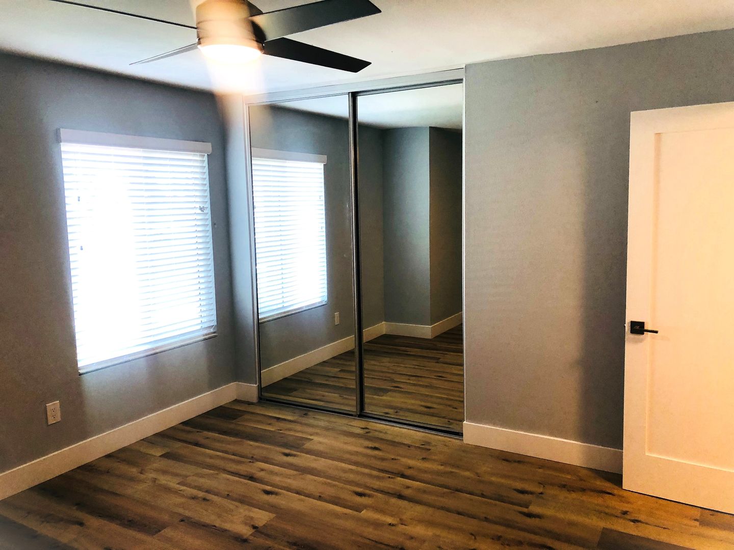 Shaker white cabinets and sparkling quartz counters with blue glass backsplash accentuate the stunning laminate wood flooring and soothing light blue walls. Includes private patio off the kitchen and attached two car garage with washer dryer hookups.