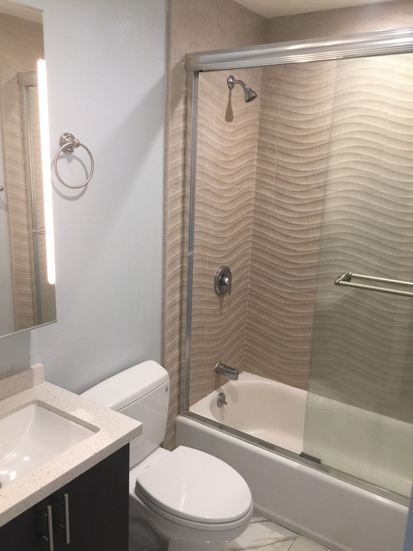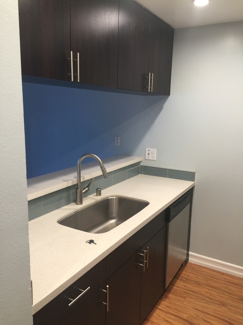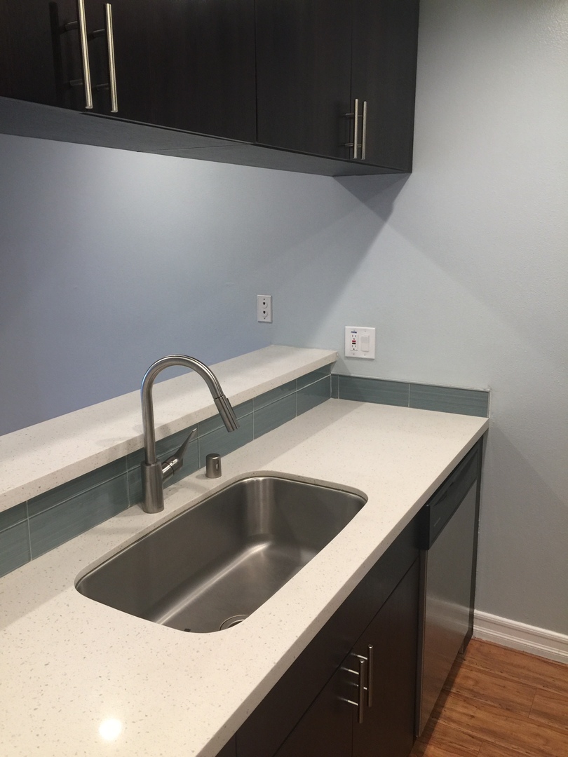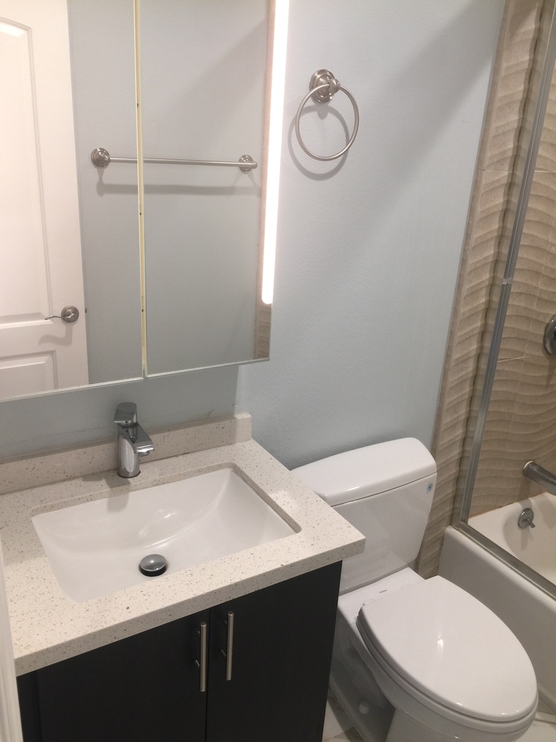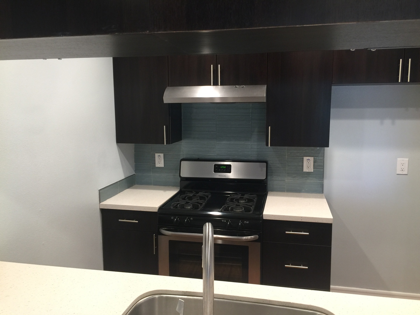 The kitchen cabinets are contemporary, mocha-colored with sparkling white quartz and glass tile backsplash. This unit has stylish laminate wood flooring throughout, except the bathrooms which have porcelain floors that resemble Calcutta marble. The color scheme exudes a soothing feeling.