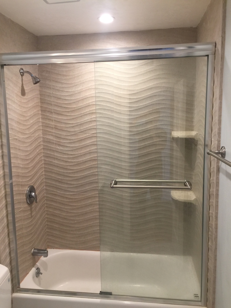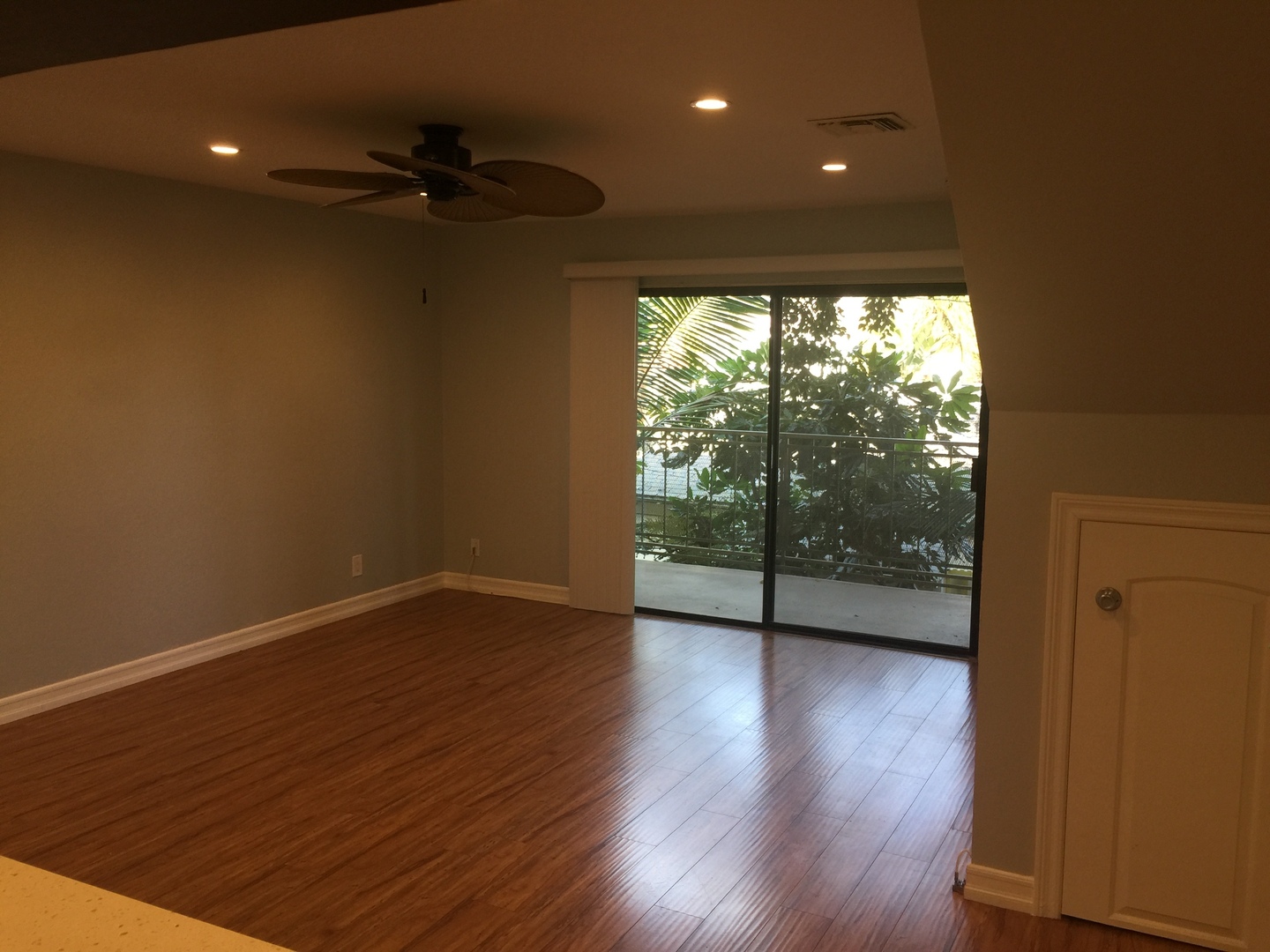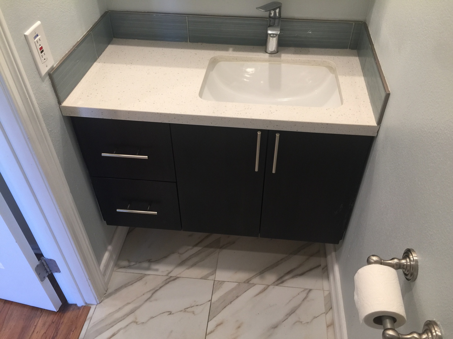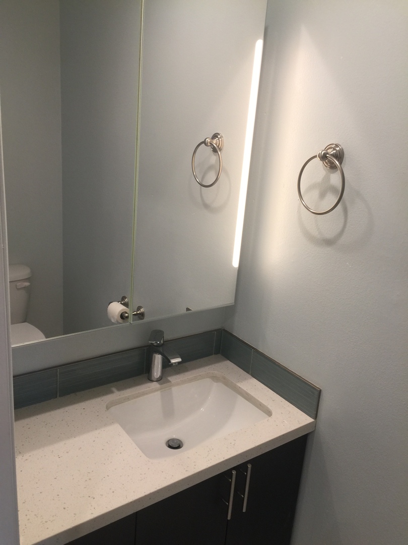 The kitchen cabinets are contemporary, mocha-colored with sparkling white quartz and glass tile backsplash. This unit has stylish laminate wood flooring throughout, except the bathrooms which have porcelain floors that resemble Calcutta marble. The color scheme exudes a soothing feeling.